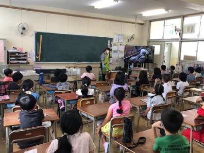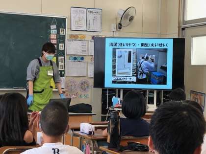 授業では、まず、開店前の店内やバックヤードの様子を映像で見ました。魚をさばいたりパンを作っている姿を見て、「すごい!プロや!」という声が上がりました。映像を見た後は、子どもたちからの質問コーナーです。事前に考えてあったので、いろんな質問が出ましたが、全部答えていただきました。
