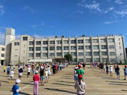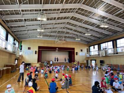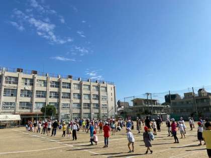 運動場では、ソーシャルディスタンスを保ちつつゲームを楽しんでいました。