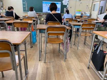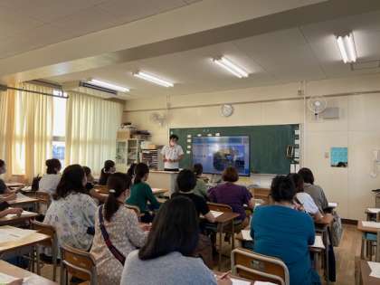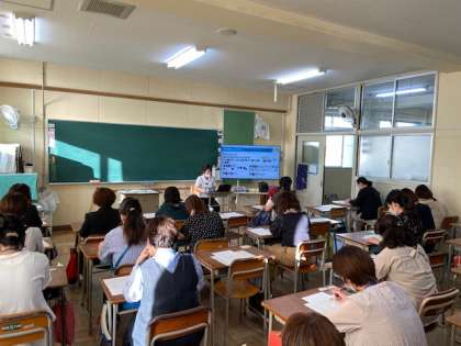 今年度は感染拡大防止の観点から、各教室にてソーシャルディスタンスを保ちながら、保護者の皆様にはお子様の席に着いていただいて行いました。