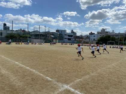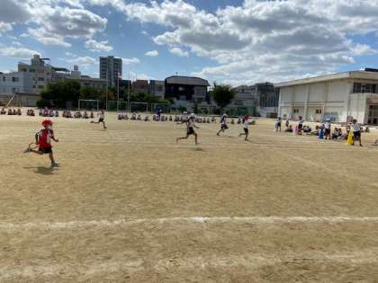 1年生が丸い円形のバトンを使ってリレーをしていました。