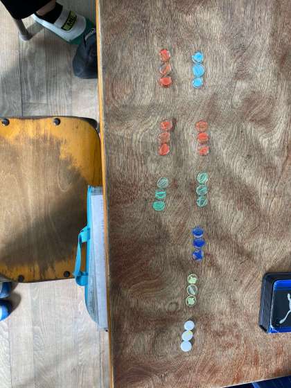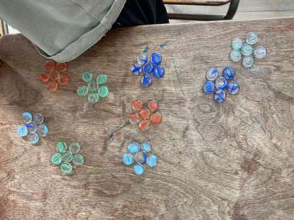 この日の学習では、おはじきでかけ算の式を表しました。
