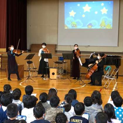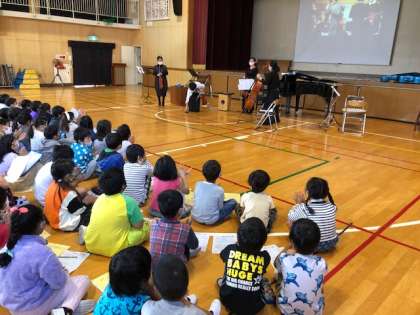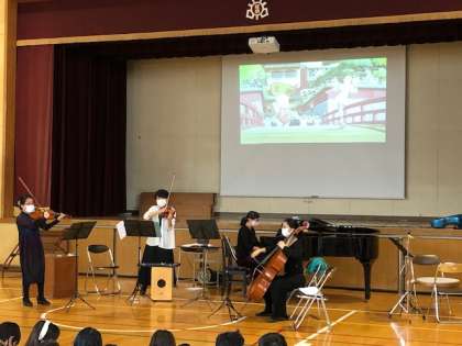 今年は、アンサンブル・サビーナの方々に来ていただき、ヴァイオリン・ヴィオラ・チェロ・ピアノ・パーカッションを使って、たくさんの曲を演奏してもらいました。「パフ」や「エーデルワイス」「いつも何度でも」など教科書に載っている曲や知っている曲があり、みんな楽しそうに聴いていました。