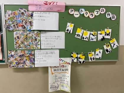 1階中央階段の掲示板にアートクラブの作品が掲示されています。