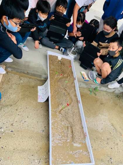 今日は、カーブの内側と外側では、水の働きがどのようにちがうのか、という実験をしました。子どもたちはタブレットで動画を撮りながら、「どうなる?!」と前のめりになりながら手作りの川に注目していました。水を流すと、カーブの外側は土が削られたことによって、立てていた旗がパタッと倒れました。