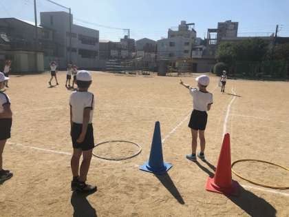 まずは、キャッチボールをしてボールを「投げる・取る」ことになれました。そして、今日は簡単なゲームをしました。自分でボールを投げ、ベースに見立てたカラーコーンにタッチすることで点数が入ります。どこに投げたらたくさん点数が入るのか作戦を考えている様子も見られました。
