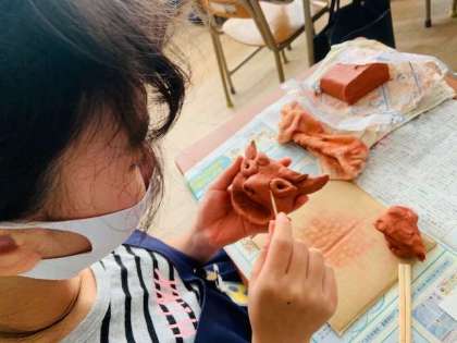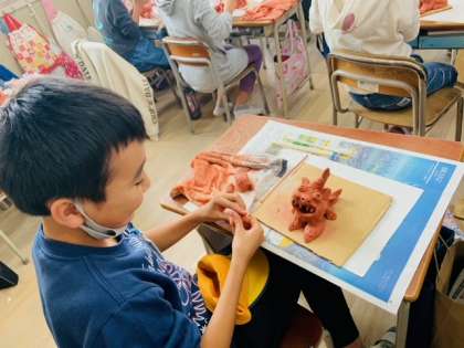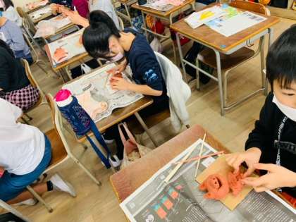 図工の時間に、土粘土を使ってシーサーを作っています。