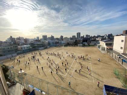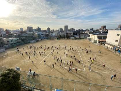 運動場でなかよし班活動「ドッジボール」をしていました。
