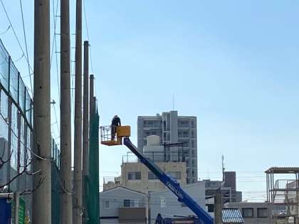 作業員の方が、クレーン車でフェンスの上のほうに移動していきます。