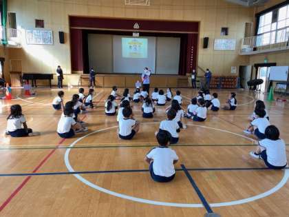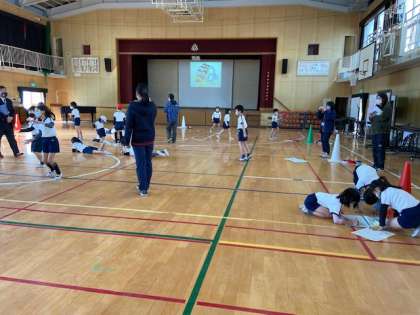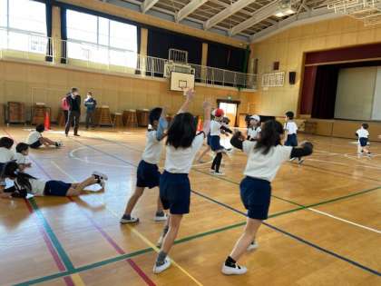 担任の先生の話を聞いて、そして、チームで動きを表現します。