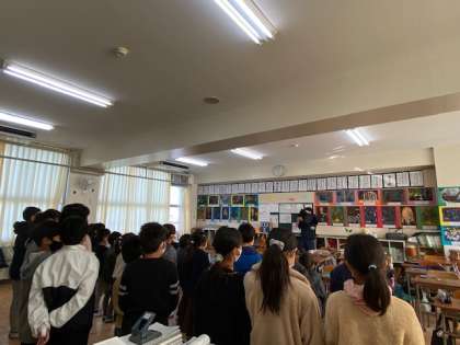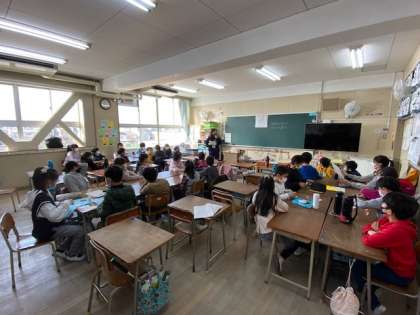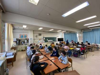 各教室になかよし班のメンバーで集まって話し合いをしています。