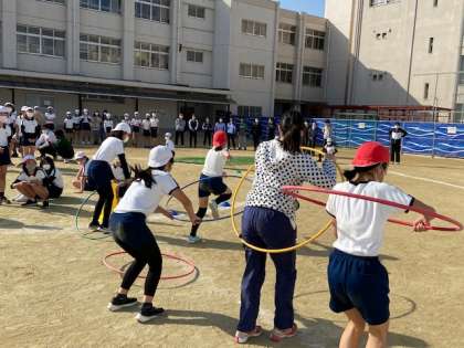 フラフープで跳んだり、網をくぐったり・・・