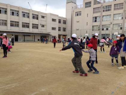 高学年が低学年の子と一緒に手をつないでとんでくれていたり、