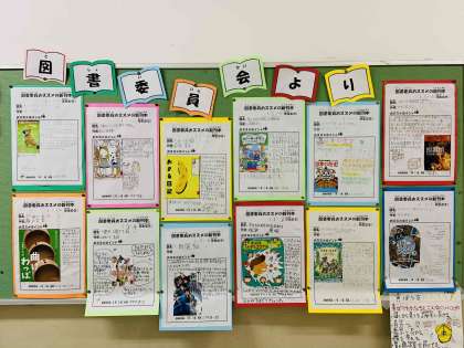 1・2年生向きの本、3・4年生向きの本、5・6年生向きの本、たくさん面白い本があります。掲示板に飾っているので、ぜひ立ち止まって見てみてください。そして、本を借りてみてくださいね。