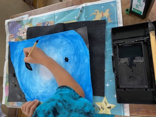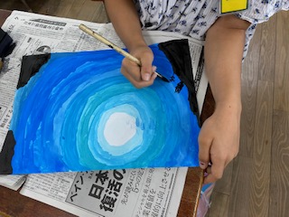 海の底から空を見上げるイメージをして絵具でグラデーションを描きました。