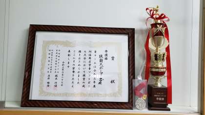 立派なトロフィーやメダル、賞状を1階廊下の棚に飾っています。