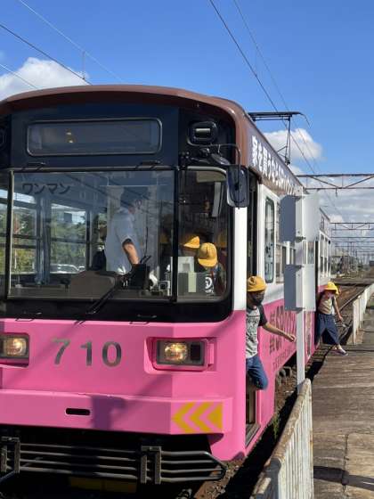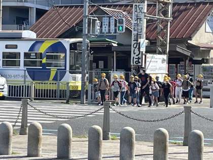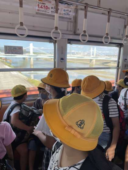 阪堺電車に揺らながら、窓から見える景色に興味津々だった子どもたち。