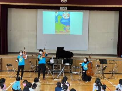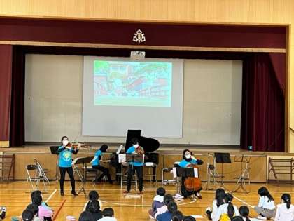 4時間目にアンサンブル?サビーナさんによる音楽体感事業がありました。弦楽器による演奏で、モーツァルトの曲やパフ、エーデルワイス、千と千尋の神隠しのメドレーなどの曲を鑑賞しました。
