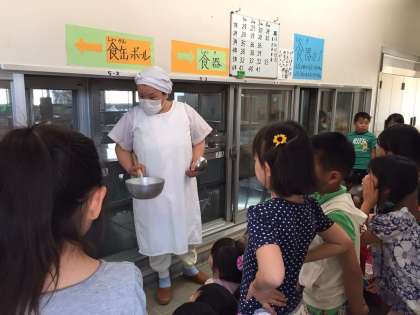 給食調理員さんに給食室で使う道具を見せてもらいました。