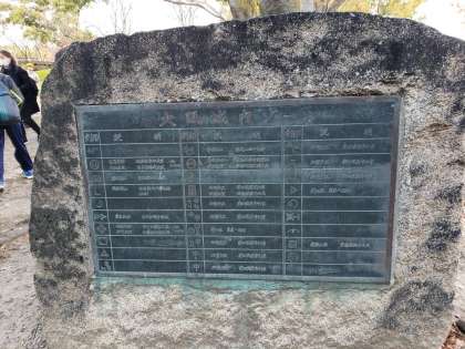 大阪城公園では、戦跡めぐりをし、石垣の爆撃被害跡や機銃掃射痕などを見ました。