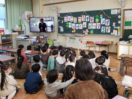 子どもたちが開会式をテレビ放送で見ています。