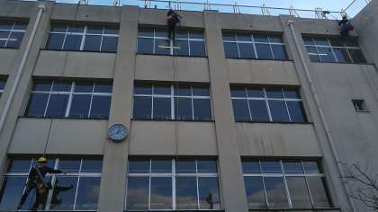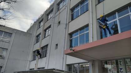 外壁の調査ですので、専門の業者が屋上からロープをたらし、クライミングの垂直降下の要領で検査をしています。