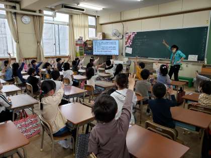 2年生の学校紹介動画や6年生からメダルのプレゼント、代表委員会で作った学校クイズなど、1年生はどれも大喜びでした。