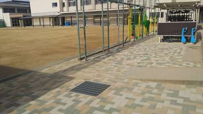 北校舎から運動場への出入り口部分がインターロッキングブロックで舗装されました。