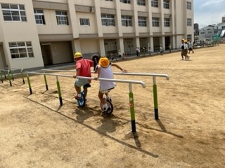 また、新校舎(東校舎)の前には鉄棒が並び、北校舎側には平行棒が設置されました。