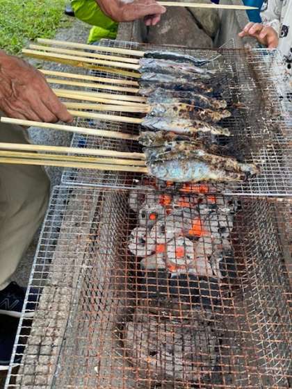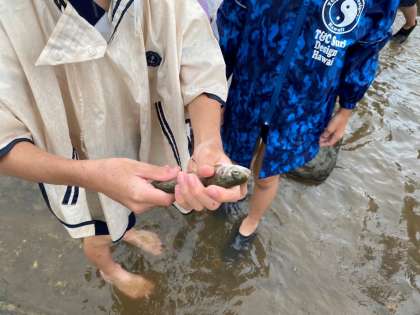 雨の降る中、レインコートを着て魚つかみがスタートしました。