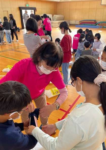講堂のコーナーでは、身近な布などを使った応急手当の方法を教えていただいています。
