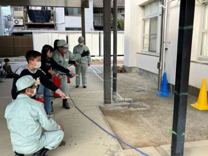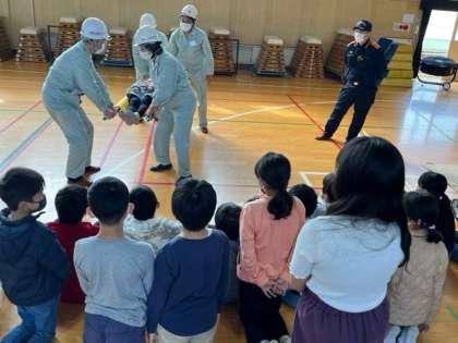 毛布と長い棒を使って人を運ぶことのできる簡易担架の作り方も教えていただき、実際に乗る体験もしました。また、講堂の外では水消火器による消火の体験をしました。