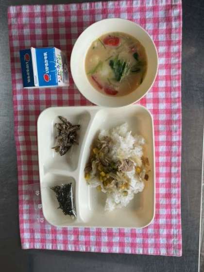 今日の給食は、正月献立で「きんぴらちらし、ぞう煮、ごまめ、牛乳」でした。