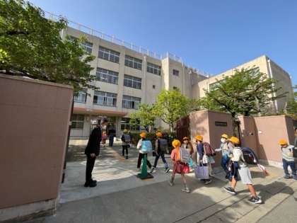 毎朝、正門のところに校長先生が立って、子どもたちと元気に挨拶を交わしています。