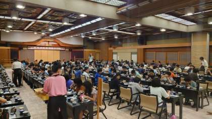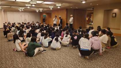 残念ながらさっきまで雨が降っていたため白良浜の散策を中止し、朝の集いは室内で集まることになりました。