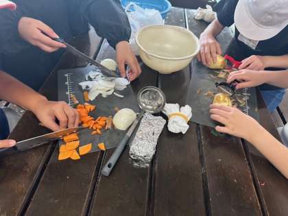 野菜を切る係、火を起こす係などみんなで協力して進めました。