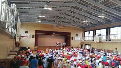 本日のふれあい集会は、運動場でドッジボール、講堂でじゃんけん列車です。