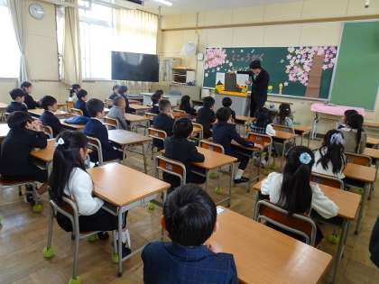学校の桜が満開の中、194名の子どもたちが阪南小学校に入学しました。