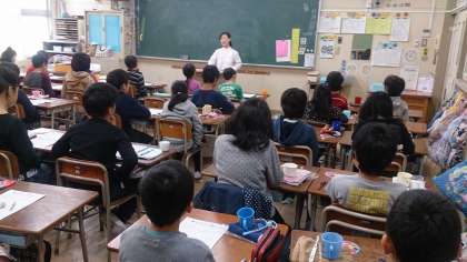 まずは、歯科衛生士さんに虫歯になってしまう仕組みや正しい歯の磨き方を教えていただきました。その後、保健室に移動してフッ化物を塗ってもらいました。