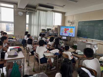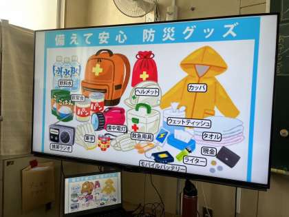 学級での防災学習では、『地震が来たらどうするの?』という紙芝居を見て、地震への備えについて考えたり、準備しておくと安心な防災グッズについて確認したりしました。
