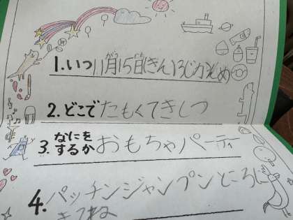 2年生では1年生をおもちゃまつりに誘うために招待カードを書いています。
