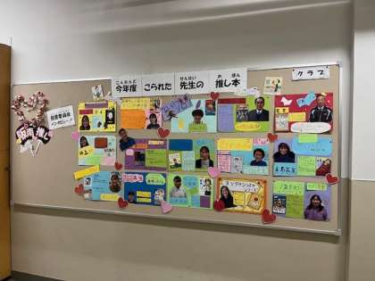 それぞれの先生方の推しポイントをまとめ、推し本の表紙と先生の写真付きで掲示しています。