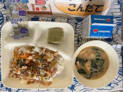 今日の給食は、かやくごはん・みそ汁・抹茶ういろう・牛乳です。