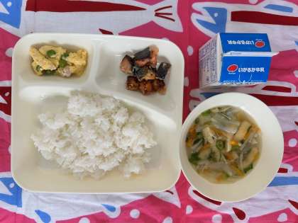 今日の給食は、さけのみそ焼き、五目汁、えんどうの卵とじ、ごはん、牛乳です。