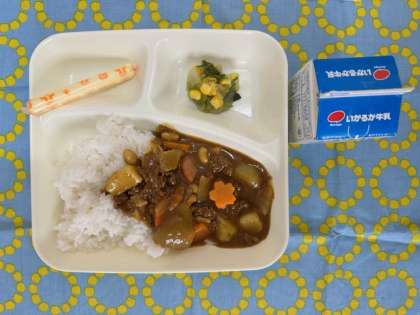 今日の給食は、牛肉と大豆のカレーライス、レタスとコーンのサラダ、棒チーズ、牛乳です。