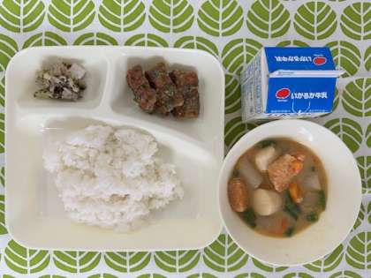 今日の給食は、ちくわのいそべあげ、あつあげとさといものみそ煮、キャベツの赤じそあえ、ごはん、牛乳です。