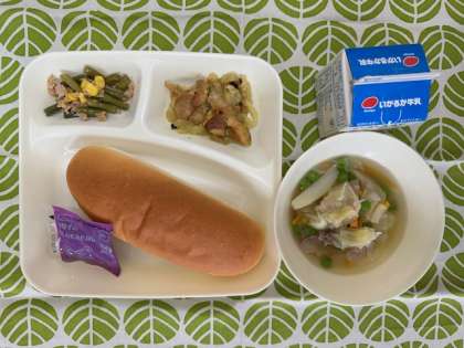 今日の給食は、鶏肉のカレー風味焼き、スープ、ツナとさんどまめのソテー、コッペパン、ブルーベリージャム、牛乳です。