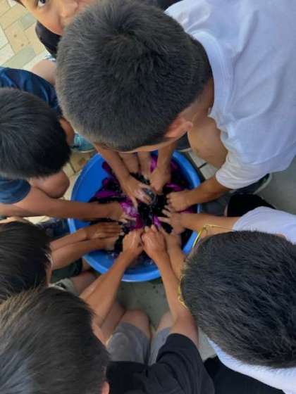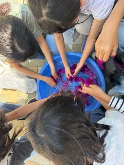 先日の運動会で使用したハッピと鉢巻を桶を使ってもみ洗いしました。