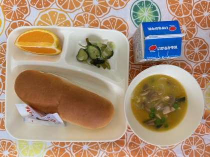 今日の給食は、鶏肉とかぼちゃのシチュー、ミックス海そうのサラダ、オレンジ、コッペパン、いちごジャム、牛乳です。
