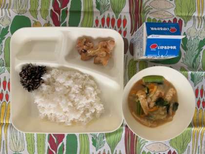 今日の給食は、鶏肉の甘辛焼き、みそ汁、魚ひじきそぼろ、ごはん、牛乳です。