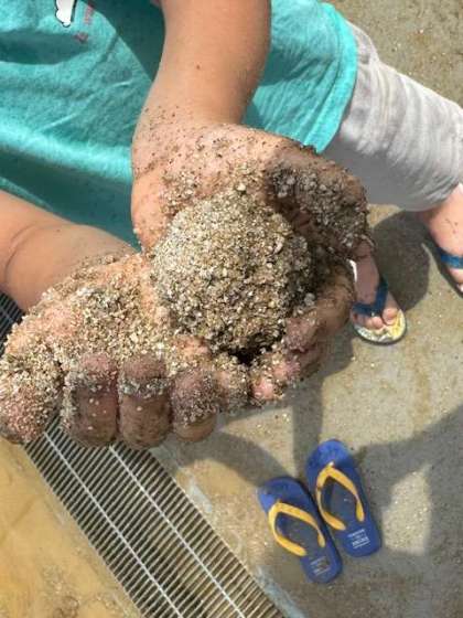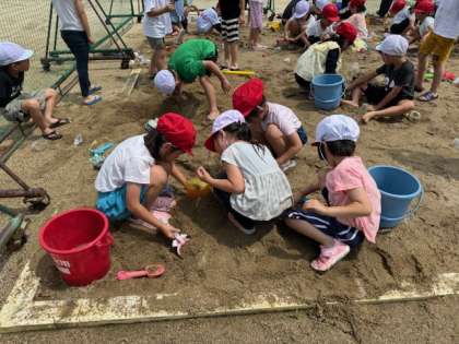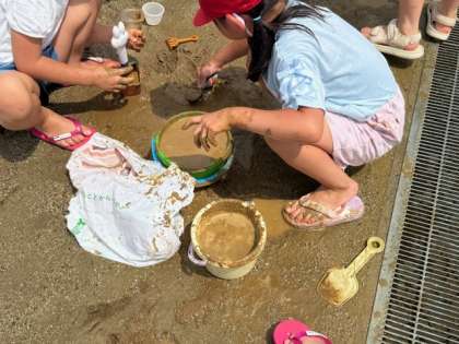 運動場の砂場を使って泥団子を作ったりスコップやバケツを使って掘ったりと楽しみました。